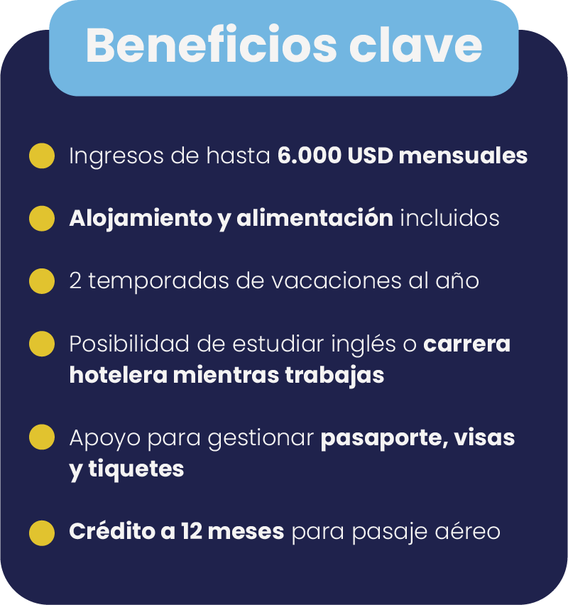 Participarás en roles iniciales como asistente de limpieza, restaurante o lobby, con posibilidad de ascenso.